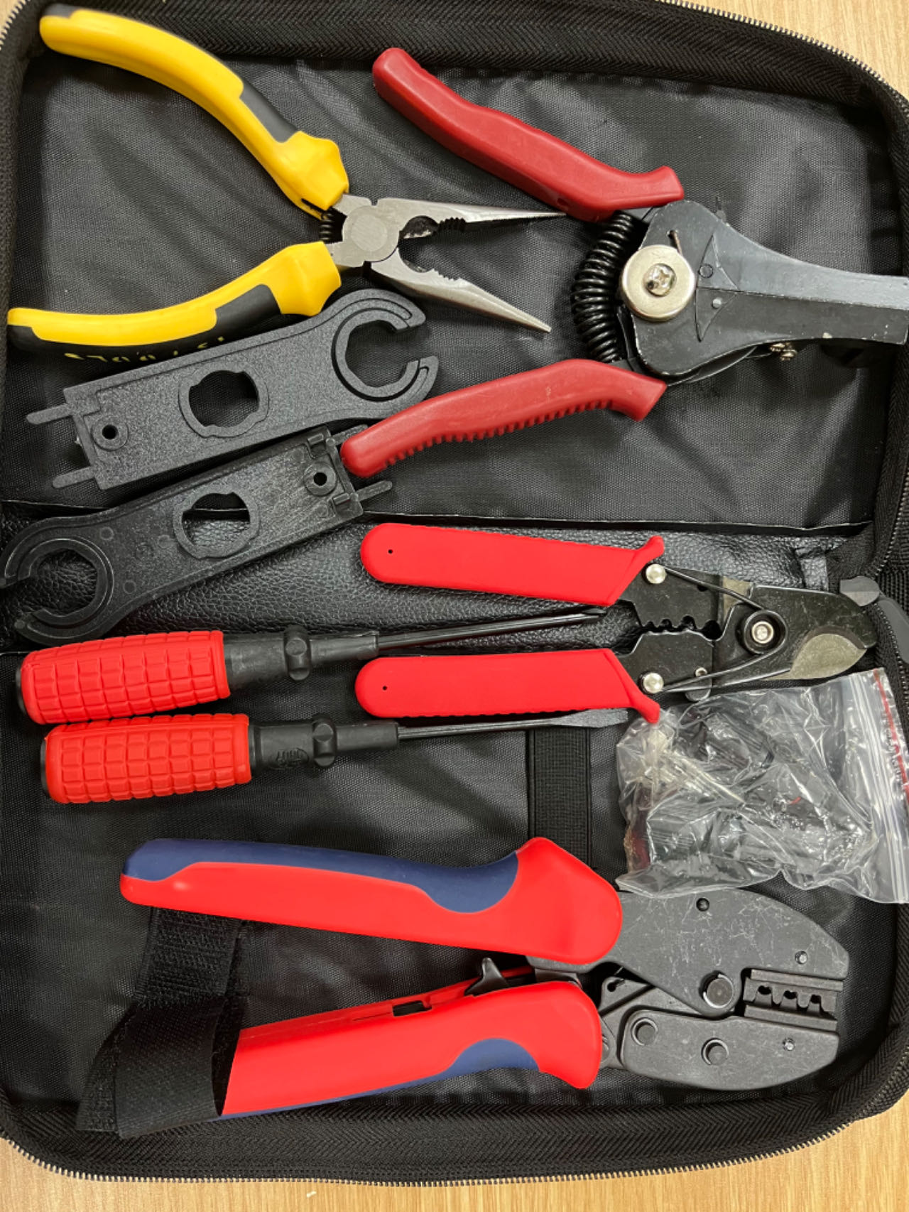 Incluye 2 crimpadoras, alicate pelacable, 2 spanner MC4, alicate de punta, destornillador de cruz y de paleta, conector MC4 macho y hembra.